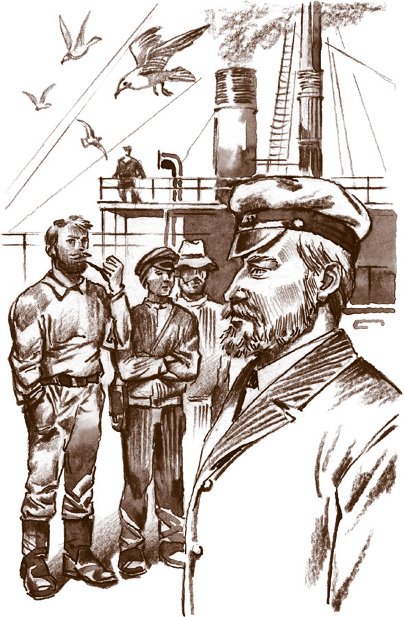 Капитан исчез, но тут же его огромная фигура показалась на сходнях. Он медленно сошел на палубу, а потом неожиданным, ловким прыжком перескочил через борт судна и очутился на пристани.