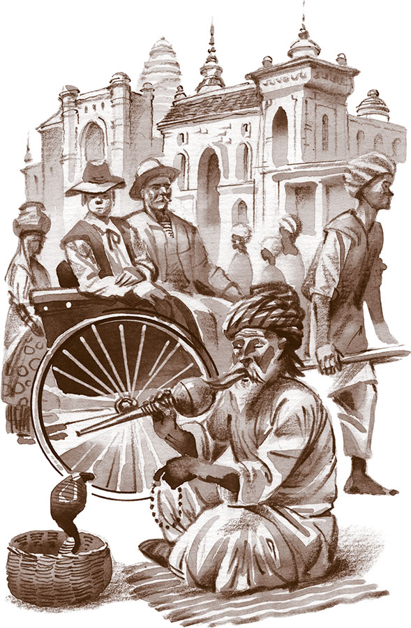 Около девяти часов вечера путешественники на рикшах поехали по указанному Аббасом адресу. Пока рикши с трудом пробивали себе путь в индийский район, путешественники могли воочию убедиться, что Индия – страна величайших контрастов. Почти на каждом шагу воображение поражали своеобразные обычаи жителей.