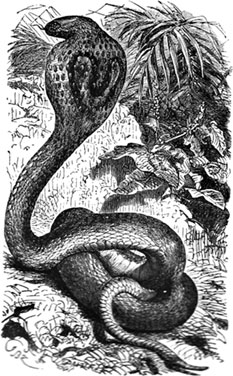 Во всей Южной Азии водится великолепно окрашенная, довольно большая и страшно ядовитая змея, которая называется очковой змеей (Naja tripudians, род Naja). 〈…〉 …основной цвет ее огненно-желтый, отчасти с голубым отблеском; на голове явственно заметен рисунок, имеющий некоторое сходство с очками, откуда и произошло название змеи. 〈…〉 Так, португальцы, впервые встретившие ее на Цейлоне, назвали ее кобра ди капелло, что означает «шляпная змея», вследствие способности кобр расширять шею, растопыривая в стороны передние 4 пары ребер. Так как змея при этом ставит переднюю часть тела вертикально, а голову изгибает горизонтально, то кажется, будто на голове надета круглая шляпа. В Индии эта змея как раньше, так отчасти и теперь пользуется почитанием. (А. Брэм. Жизнь животных, т. 3.)