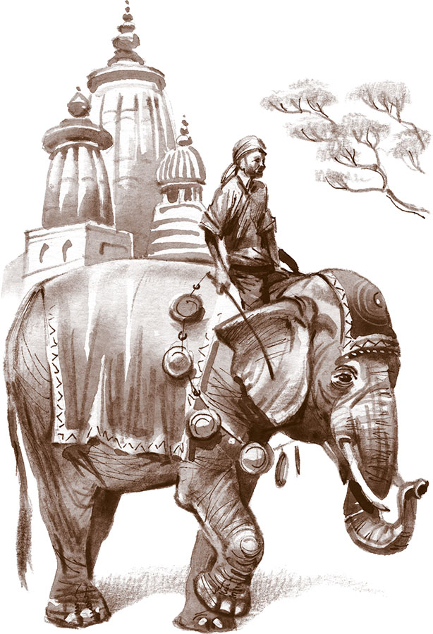 На торговую площадь медленно входило странное шествие. Один за другим шли огромные слоны. На спине каждого из них сидел махут[47], который управлял животным с помощью ударов бамбуковой палки. Махуты криками на языке хинди[48] разгоняли людей, упрекая их в медлительности, а слоны двигали ушами, как веерами, и бесстрашно врезались в толпу, расступающуюся перед ними. Слоны топтали лотки, но, несмотря на это, не раздавалось ни одного слова протеста. Словно из-под земли появлялись мальчики с большими круглыми корзинами. Как только какой-нибудь из слонов приостанавливался по своей нужде, мальчики немедленно подставляли ему свою корзину.