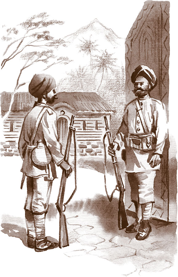 Доступ к строениям дворца преграждали массивные, деревянные, искусно украшенные резьбой ворота. У ворот стояли часовые из личной охраны магараджи. Низкорослые, жилистые солдаты были одеты в тесные белые куртки, застегнутые спереди на большие пуговицы, и штаны того же цвета, стянутые обмотками над босыми ступнями. На голове солдаты носили чалмы лимонного цвета, а в талии были опоясаны шарфами того же оттенка; к шарфам были прикреплены патронташи.