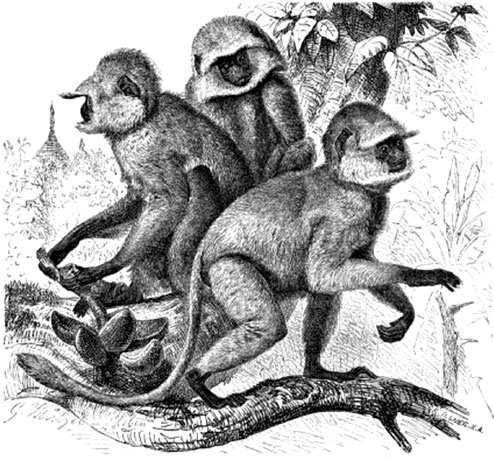 В Индустане повсюду, за исключением горных местностей, особенно распространен один вид тонкотелых хульман, или хануман, священная обезьяна индусов (Semnopithecus entellus).