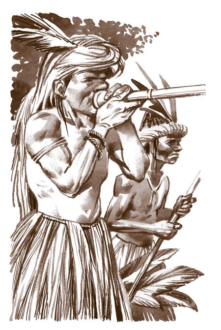 Отряд вооруженных людей в ночной темноте крадучись окружал лагерь сборщиков каучука. Когда гроза и ливень прошли, вооруженные люди, прячась в густом подлеске, сомкнули кольцо вокруг раскорчеванной площадки. Это были индейцы племени ягуа, отличавшиеся светло-коричневым цветом кожи. Их нагие тела прикрывали только пышные юбки из рафии[13], доходившие до щиколоток. Головы индейцев украшали огромные парики, сплетенные из желтого волокна рафии, свободно падавшего на их плечи и ниже, до самого пояса. У некоторых в париках торчали перья попугаев, засушенные птицы и мыши. Индейцы носили ожерелья из семян растений. Они были вооружены луками и длинными духовыми ружьями из стеблей бамбука[14], из которых выпускали небольшие, иногда отравленные стрелы. Южноамериканские индейцы использовали эти ружья для охоты, но в военном походе в руках индейцев они превращались в грозное оружие. От попадания небольшой стрелы противник погибал почти мгновенно.