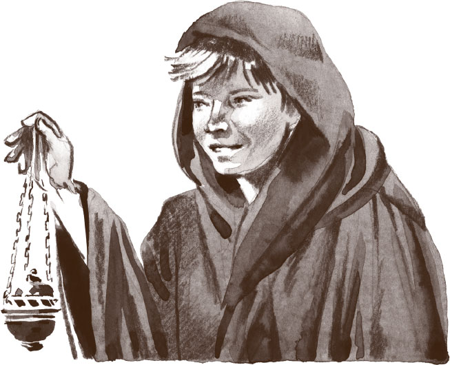 Мальчик на цыпочках приблизился к столику, высек огонь и зажег светильник, прикрыв огонь рукой, чтобы не разбудить спящего. И счастье улыбнулось ему! В углу, на груде разных предметов, лежало кадило. Патрик поставил светильник на край стола и, взяв украденную вещь, начал потихоньку пробираться к двери.