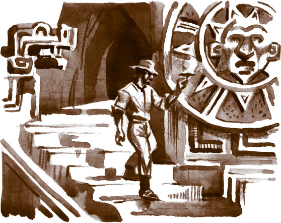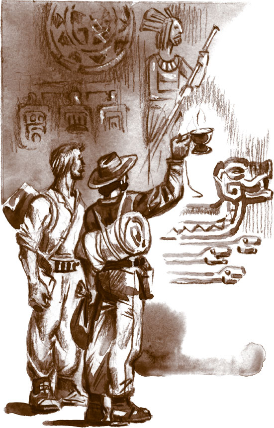 Смуга, откинув циновку, вышел. На ощупь добравшись до лестницы, спустился на один пролет. Достал из кармана оставленный Томеком коробок со спичками, который берег на черный день. Желтоватое трепещущее пламя выхватило из тьмы кусок скалы, на которой проступили резные изображения звериных голов. Смуга левой рукой притронулся к голове ягуара, задул спичку, сунул ее в карман, чтобы не оставить следов. Обеими руками он повернул голову ягуара, после чего нажал на стену. Часть ее подалась в сторону, образовав щель. Смуга протиснулся в нее, тут же задвинул назад каменную створку, опустил запор. При свете второй спички вынул из углубления в стене светильник и зажег его. Затем спустился по крутой, сходившей вниз каменной лестнице в грот. На стенах грота проступали барельефы с символами Солнца.