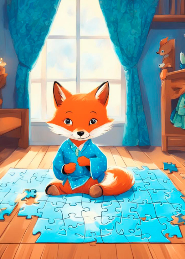 Он разложил подарок на полу и детальки стали складываться одна за другой. С таким изумлением лисенок их собирал, что заметить не успел, как и картинка уже получилась.