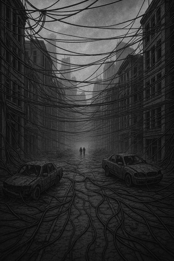 Тысячи тонких чёрных линий, сплетённых, свитых, переплетённых друг с другом. Они тянулись от стен, от столбов, изнутри зданий – и, что самое странное, из самой земли. Будто город пророс ими, как деревьями, только вместо жизни в этих «корнях» чувствовалась чуждая, неестественная энергия.