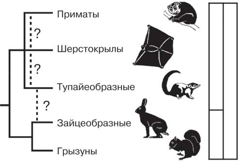 От эуархонтоглиров берут начало две ветви. Одна из ветвей приводит к отрядам приматов, тупайеобразных и шерстокрылов, а другая – к зайцеобразным и грызунам. Тупайи – это небольшие зверьки, обитающих в тропических лесах Юго-Восточной Азии и представляющие собой нечто среднее между крысами и белками. А шерстокрылы – это древесные млекопитающие, которые тоже живут в Юго-Восточной Азии. Все конечности, хвост и шея шерстокрылов соединены между собой плотной, покрытой мехом (отсюда и название) перепонкой, которая дает им возможность планировать с высоты. Летать в полном смысле этого слова шерстокрылы не могут.