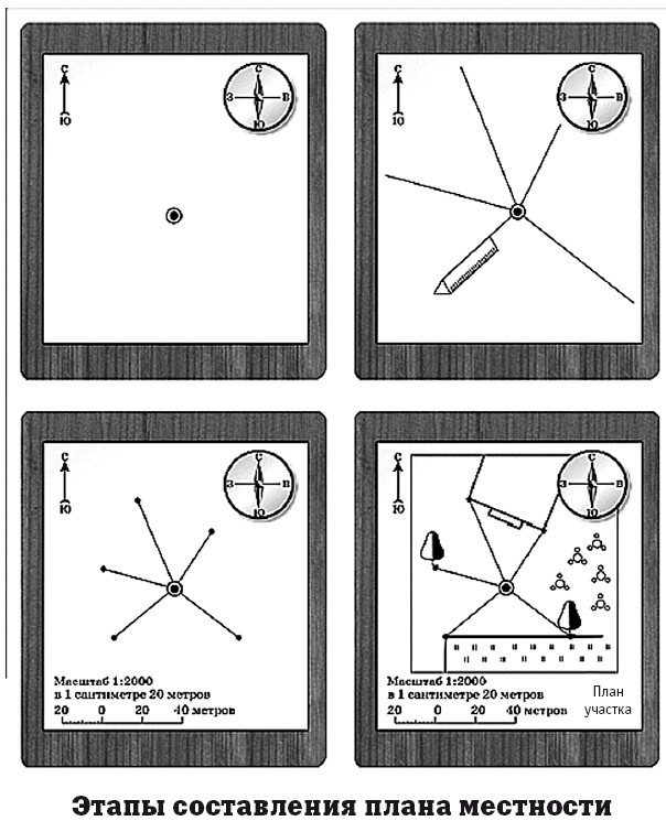 До начала съемки нужно определиться с масштабом. Масштаб выбирается не произвольно, а со смыслом. Он должен соответствовать цели составления плана, то есть должен быть таким, чтобы на плане было показано все, что требуется. Отметьте в нижней правой части листа линейный масштаб в метрах. Для удобства работы расчертите тонкими карандашными линиями лист бумаги на одно-двухсантиметровые квадраты. Эта сетка поможет вам точнее наносить объекты на план. После того, как план будет составлен, сетка стирается.