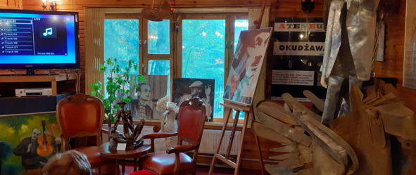 Рядом, буквально в ста метрах, находится дача семьи Булата Окуджавы. Сейчас это музей имеет статус государственного. Директор музея – его жена, которой сейчас более 80 лет. В этом году 9 мая в Москве праздновали не только День Победы, но и 95-летие со дня рождения выдающегося поэта. Наследие Б. Окуджавы – пять исторических романов, нескольких десятков рассказов, более 800 различных стихов, 200 из которых положены на песни, 80 с лишним художественных фильмов использовали стихи и песни Б. Окуджавы. И, несмотря на то, что он был великим творческим человеком, жил очень скромно. Помимо экскурсии в музей, отражающий его жизнь, представлены его библиотека, рабочий стол, где он собирался со своими друзьями. А друзьями его были В. Высоцкий, Э. Рязанов, Б. Ахмадулина, З. Церетели, Е. Евтушенко и другие. Ну, и конечно, в музее выставлена знаменитая коллекция колокольчиков, начало которой положила Белла Ахмадулина.
