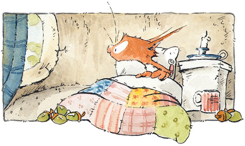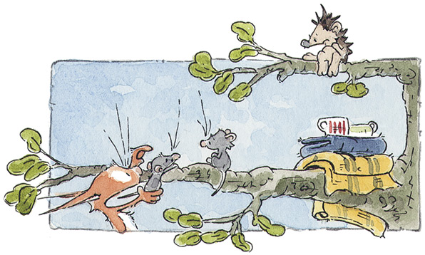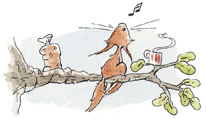 Конечно, Бельчонок жил на дереве не один. У него были соседи: Хетти, крошечная птичка крапивник, и Хоп, древесная лягушка квакша. Хетти порхала с ветки на ветку, а Хоп прилипал к стволу то тут, то там. Обычно в тех местах, где его меньше всего ожидаешь встретить. А ещё в дупле у самых корней обитали три сони. Впрочем, вернёмся к бормотанию!