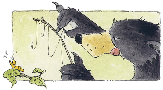 – Хм, дай подумать… – сказал Медведь, – сижу в лодке, опустив удочку в воду, и жду, когда клюнет рыба.