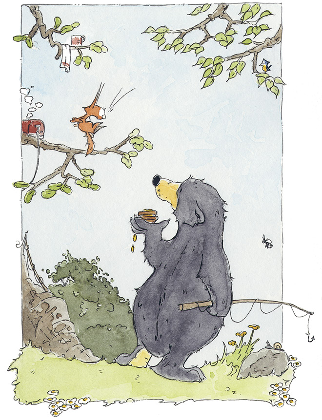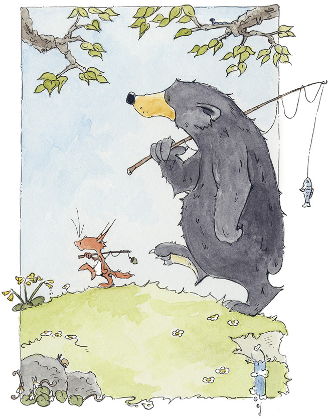 Бельчонок тяжело вздохнул над чашкой чая. Тут появился Медведь. Он пришёл, чтобы позвать Бельчонка на рыбалку.