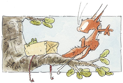 Вот и сегодня утром, выбравшись из уютного-преуютного спального дупла, Бельчонок обнаружил под деревом какую-то коробку. «Наверняка это для сонь», – решил он. Они получали ужасно много писем и посылок. Бельчонок приготовил себе чай, а потом спустился за коробкой, принёс её наверх и положил между ветвями. И вдруг обнаружил, что та адресована вовсе не соням, а ему самому! Кто же мог отправить такую большую посылку? Бельчонок призадумался:
