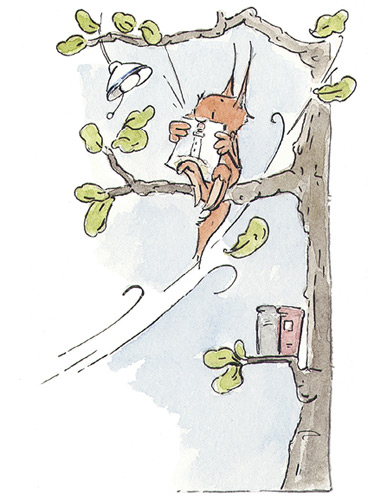 Так что Бельчонок опустил рычажок, нажал на турбокнопку и замер в напряжённом, словно тетива лука, ожидании. Время тянулось, как резина. Но зато потом всё произошло одновременно. Раздался тихий щелчок, нагревательные элементы погасли, рычажок подскочил вверх, а вместе с ним и хлебные ломтики. И прежде чем Бельчонок успел подпрыгнуть, схватить их на лету, да и вообще хоть что-нибудь сделать, последние тосты, как и все предыдущие, улетели в лес. И это было совсем не «супер» и вовсе не «отлично», ведь Бельчонок не на шутку проголодался. Он понуро сидел на своей ветке для завтрака с чашечкой чая и красным тостером, но без единого тоста. На мгновение ему показалось, что даже прекрасный новый тостер и отличная турбокнопка не спасут это невесёлое утро.
