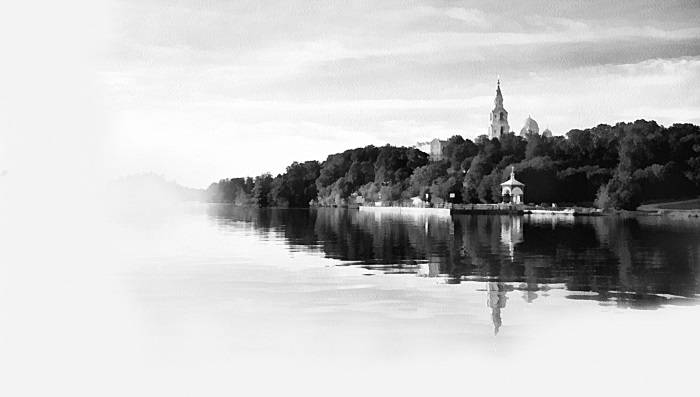 Открываю глаза… – где день? Мутно белеет занавеска, пузырится от дуновенья – веянья валаамской ночи. В шелку от занавески видно: лес за проливом смутен, небо зеленовато-бледно, точками намекают звезды. Вспоминаю, что я на Валааме, в чудесной дали. Радость поет во мне. Тихо иду к окну, чтобы не потревожить спящую, отдергиваю тихо занавеску. Какая тишина! Темная глушь на скалах за проливом, в ней ничего не видно – острые пики елей? Где-то, чуть слышно, Ладога – еще тревожна. Это направо, у Никольского островка-скита, зоркого стража Валаама. Там, говорят, маяк. Так, говорят, Святитель – «зовет огнем». Пахнут петунии. Падают сонные удары – … три… семь… восемь… Восемь…