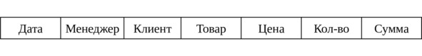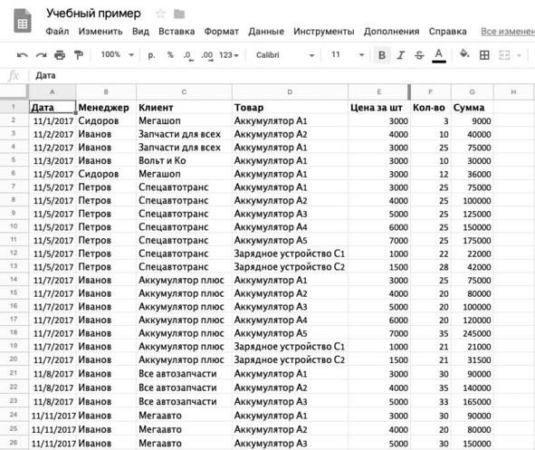 Нам нужно получить данные для анализа и построения на их основе прогноза продаж. Для этого нужно выгрузить из 1С или CRM-системы историю продаж по уже существующим в компании клиентам. Пример такой выгрузки может выглядеть следующим образом.