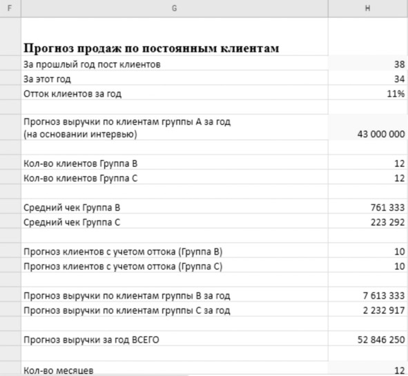 Мы сделали большое дело, а именно, рассчитали планируемый объем продаж по базе постоянных клиентов. Теперь это ориентир для отдела продаж компании, которому они должны следовать. Тем самым мы сделали свои продажи прозрачными и управляемыми. Ежемесячно мы будем сверяться с данным ориентиром, чтобы сделать вывод, все ли идет по плану или нужно предпринимать корректирующие действия.