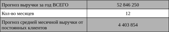 В итоге мы можем подготовить следующую таблицу по прогнозу выручки с постоянных клиентов компании в 2019 году. Для этого суммируем прогнозы по всем трем категориям клиентов (А, В и С), тем самым получаем сумму в 52 846 250. Делим эту сумму на 12 месяцев и получаем прогноз средней месячной выручки от постоянных клиентов.