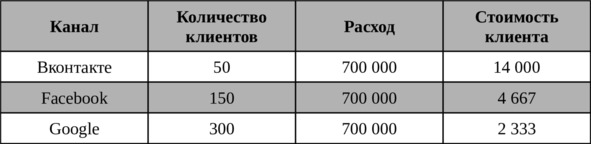 В этом случае вы можете запросить у вашего маркетолога или рекламного агентства информацию в следующем виде и посчитать стоимость привлечения клиента.