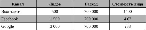 Если же у вас в компании не настроена сквозная аналитика, то вы не сможете построить данную таблицу, а сможете оценить только стоимость лида (при условии, конечно, что у вас есть на сайте счетчик Google Analytics или его аналог) следующим образом.