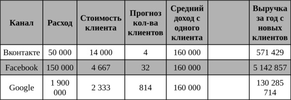 Например, таким образом. В нашем примере наименьшая стоимость клиента была в рекламном канале Google. Соответственно, мы и перераспределим рекламный бюджет, который составляет в нашем пример 2 100 000 рублей (по 700 000 рублей на каждый канал, см. таблицу выше) в сторону данного канала следующим образом.