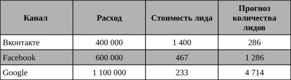 Нами уже была посчитана стоимость лида (в варианте отсутствующей системы сквозной аналитики). Берем данные значения. Перераспределяем рекламный бюджет в сторону канала Google, так как данный канал показывает самую низкую стоимость лида. Далее делим размер рекламного бюджета (колонка «Расход») на стоимость лида и получаем прогнозное значение по ожидаемому количеству лидов из каждого рекламного канала.