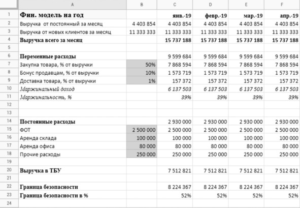 При изменении показателей по выручке и расходам мы сможем увидеть, как будет изменяться ТБУ (точка безубыточности) компании и ее граница безопасности. Данный пример является упрощенной версией финансовой модели, которая уже позволит вам моделировать важные для компании показатели и анализировать, как будет развиваться ситуация.