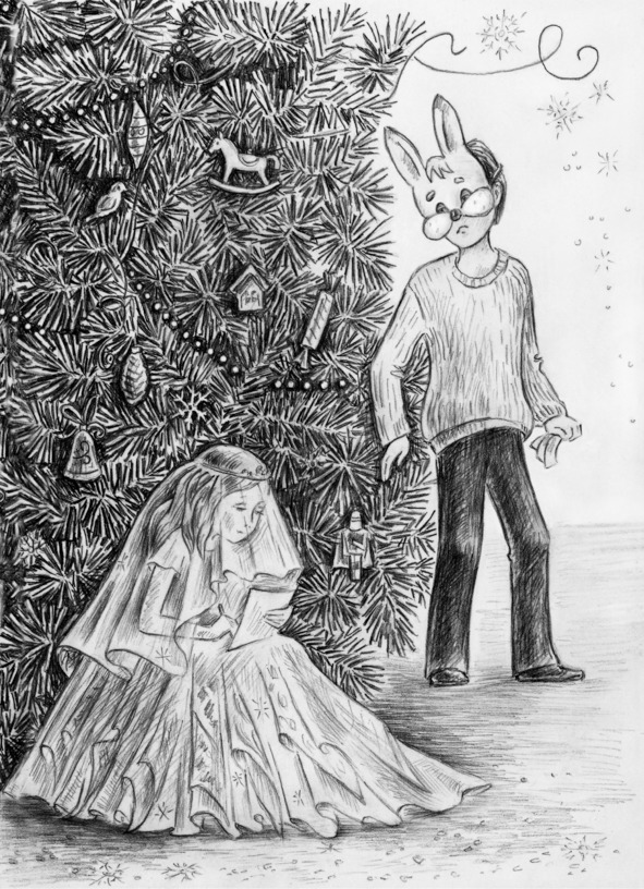 В отличие от других ребят, у которых были шикарные костюмы, ему не хотелось в такой экипировке изображать перед всеми зайчишку. Поэтому он тихонько прошмыгнул за ёлку, где можно было спокойно переждать этот весёлый и шумный карнавал.