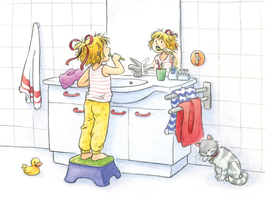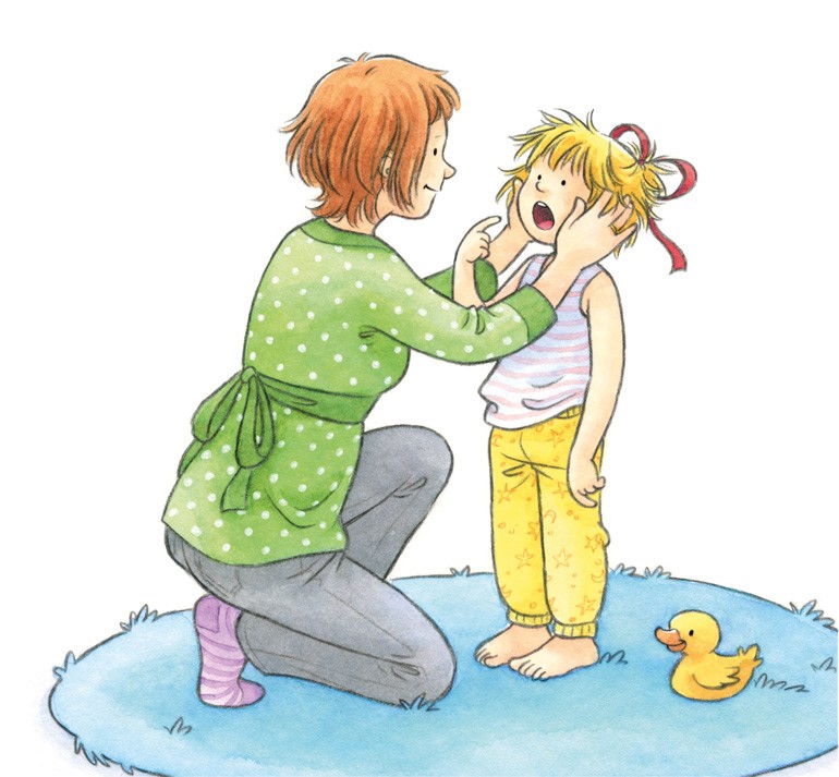 – Давай попробуем ещё раз, – предлагает мама и сама чистит Конни зубы. Но пятно действительно не счищается.
