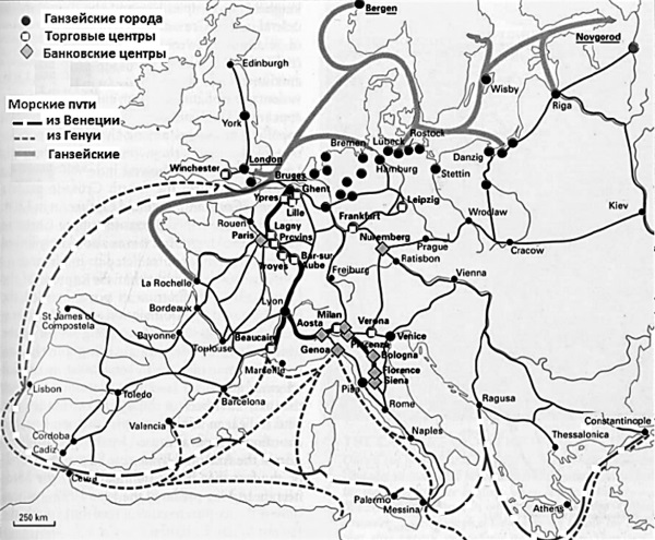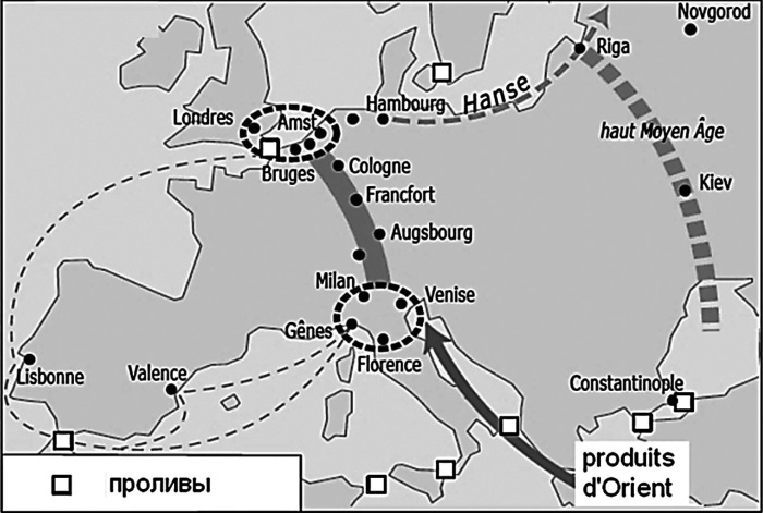 До Крестовых походов товары с Востока поступали в Европу через Константинополь, и важными торговыми путями были «путь из варяг в греки», Константинополь – Киев – Рига (предшествующая «голубому банану» стержневая линия Европы), и Ганзейский союз. После Крестовых походов вся торговля с Востоком пошла через Венецию.