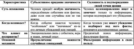 • Склонность к подтверждению своей точки зрения : человек выбирает и замечает только ту информацию, которая соответствует его убеждениям.