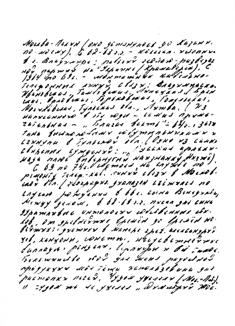 Дальше вот какие вехи. В 1958 г. – изгнание из МГУ. 58–59 гг. работы подсобником каменщика на подмосковных стройках. 60–61 г. – рабочий на строительстве шоссе Москва – Пекин (оно дотянулось до Рязани, по-моему). В биолого-разведочной станции на Украине… С 1964 по 69 год монтажник кабельно-телефонных линий связи: Владимир, Ивановская, Тамбовская, Липецкая, Могилевская, Гомельская, Тульская обл., Литва. Из написанного в эти годы – самая примечательная – «Благая весть» 1964, зачитана высоколобыми собутыльниками и сгинула в Тульской обл. (Одно из самых свирепых суждений: «Русская арлекиниада плюс вывернутый наизнанку Ницше».) С 69 по 74 г. состоял на службе по ремонту телеф. – каб. линий связи в Московской обл. (географический диапазон съежился по случаю рождения сына Венедикта в 66 г.). Между делом, в 66–69 г. писал для сына дурашливые антологии собственных стихов, от древнейших времен до времен новейших: в манере греческой, александрийцев, канцоны, сонеты, несусветнейшие баллады, ронделы, верлибры и все такое. Большинство этой для меня радостной продукции моя теща использовала для растопки печей. Чудом уцелели «Москва – Петушки» и чудом не уцелел «Димитрий Шостакович». Обе писались весело и безоглядно (и с вдохновением, выражаясь анахронически). Первая с 18 янв. 70 г. по 7 марта 70 г. (с урывками будничного свойства – в общежитии-вагончике, с системой трехъярусных нар и пр.). Вторая с 3 февр. 72 г. по нач. апреля 72 г. (в условиях тех же, но с помехами помельче). Первая исчезла через неделю по окончании и чудом была отыскана в г. Гусь-Хрустальном Влад. обл. усилиями кафедры рус. лит-ры МГУ. Вторая пропала бесследно в мае 72 г. Поиски в 73 г. прекратились, а несколько моих почти клятвенных заверений восстановить оказались неисполнимо вздорными: т. е. сюжет и буффонада еще по силам, а все остальное – нет. С 74 г. – в паразитологической экспедиции по борьбе с «окрыленным кровососущим гнусом» (именно так). С 76 г. – в геофизической экспедиции в Сев. Карелии. В середине 70‐х годов развлекся составлением учебников для сына (учеб. географии, истории, философии, лит-ры etc.) с перекувыркиванием всех привычных представлений. Тут уже отталкивание от моего наперсника Вадима Тихонова, путающего, между нами говоря, Генри Форда и Эрнста Резерфорда, Оффенбаха и Фейербаха, Рембрандта и Вилли Брандта, Жоржа Марше и Жерома Бомарше и пр. Это все кратковременная отдушина. В последние два года влез с головою во все, что имеет хоть косвеннейшее отношение к еврейским судьбам (в самом безбрежном смысле этого понятия). Материалов скопилось столько, что хватило бы и на «фарс с летальным исходом», что и обещал к нынешней весне, и на что-нибудь пообъемнее (я не о количестве страниц). Еврей, т. е. должен пройти насквозь, хотя речь не только о них, да и вовсе не о них. Ну, допустим, как спиртное в «Москве – Петушках». А вот о спиртном. С 1 октября прошлого года я, максималист, с ним совершенно «завязал»… Не замедлила явиться цепь неофитов-последователей в столичной и ленинградской среде художников и литераторов. Не знаю, дурно ли на мне это скажется, хорошо ли, – но пока только непрерывная утомляемость от всего на свете, ничем не окрыленность, никуда не желание, ни во что не погруженность и пр. «Я на шестом месяце», – говоря по-женски, а конца не предвижу.