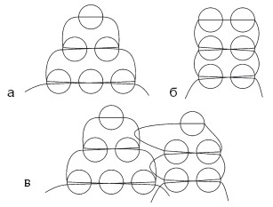 Параллельное низание: а) с добавлением бисерин; б) низание одинаковых рядов; в) сцепка двух половинок