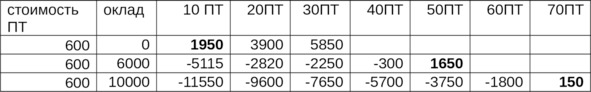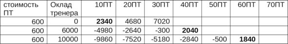 При стоимости Персональной Тренировки (ПТ) 600 рублей и при окладе в 6000 или 10000 рублей в месяц, клуб получает прибыль в виде двух тысяч рублей соответственно после 40 и 60 персональных тренировок проводимых тренером. Это я еще не учел 6% налогов на весь объем выручки.