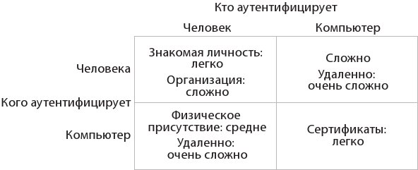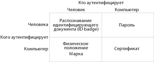 Как показано на рисунке 1.1, средства аутентификации различаются в зависимости от того, какая сущность пытается доказать свою идентичность, и от того, какая сущность выполняет проверку.