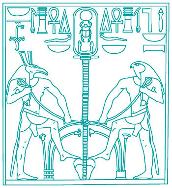 Боги Сетх (слева) и Хор (справа) оплетают иероглиф, обозначающий «единство», стеблями лилии и папируса, которые символизируют Верхний и Нижний Египет соответственно.