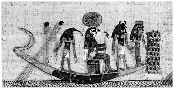 Ра – божество с головой сокола – плывет по небу на солнечной ладье