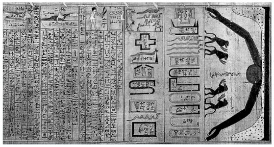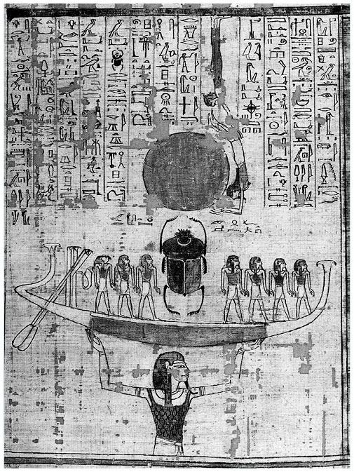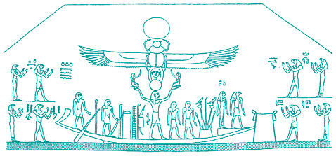 Огдоада Гермополя возле солнечной ладьи, по четверо богов с каждой стороны
