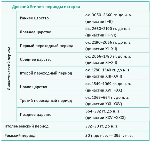 В наши дни египтологам приходится иметь дело с разрозненными, фрагментарными ссылками на мифы и легенды, почерпнутыми из разнородных источников. Разброс дат при этом огромен: от 3050 года до н. э. до первых веков н. э. Как мы видим, эпоха Древнего Египта продлилась чрезвычайно долго – около трех тысяч лет, в зависимости от того, где проводить хронологические границы. Поскольку установить конкретные даты событий теперь крайне сложно, ученые предпочитают ориентироваться на времена правления известных нам царей или даже целых династий. В III веке до н. э. историк и жрец Манефон насчитал тридцать династий египетских фараонов (позднейшие авторы добавили к ним еще одну). При династическом подходе должны четко выделяться эпохи правления определенных семейств, однако в своей периодизации Манефон использовал также крупные события – строительство первой пирамиды или перенос столицы в другой город. Современные египтологи объединили династические периоды Манефона в более крупные хронологические единицы, выделив эпохи единовластия (Раннее царство, Древнее царство, Среднее царство, Новое царство и Позднее царство) и годы геополитической раздробленности (Первый, Второй и Третий переходные периоды). За этими этапами Династического периода последовал Птолемеевский период, когда Египтом правили греко-македонские властители, а затем Римский период. В своей книге я придерживаюсь общепринятой датировки.