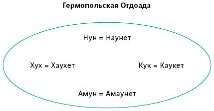 Нун – безбрежный хаосДо начала творения Вселенная представляла собой бескрайний океан – темный, безжизненный и недвижный; бороздить его было бы удобнее на подводной лодке, чем на космическом корабле. Не существовало отдельных стихий, неба и земли, жизни и смерти – лишь безымянный хаос. В таком виде – в молчании и неподвижности – Вселенная пребывала целую вечность. Считалось, что человеческий разум не в силах до конца постичь ее состояние; однако древние египтяне пытались это сделать, представляя взаимосвязанные элементы безбрежного океана в виде четырех неразрывных пар – мужчин-лягушек и женщин-змей. Нун и Наунет символизировали безграничные воды хаоса, Хух и Хаухет – бесконечное пространство, Кук и Каукет – мрак, Амун и Амаунет – сокровенное. Эти четыре пары нередко называют восемью изначальными богами Гермополя, или Огдоадой (от греческого слова, означающего восьмерку).