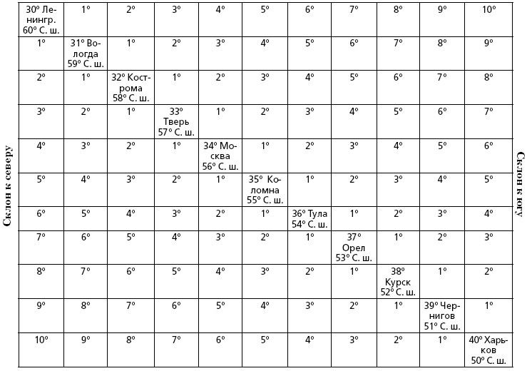 Под Москвою, Владимиром или Нижним Новгородом – 56 °Cеверной широты, – угол падения солнечных лучей во время весеннего равноденствия = 34°. На всякий градус склона получается и градусом более или менее угол падения солнечного луча; следовательно, склон к северу от Москвы на 1° дает угол в 34-1 = 33°, что и равняется углу падения солнечных лучей на горизонтальной плоскости под Тверью, находящейся под 57 °Cеверной широты. Таким образом, даже такой малозаметный склон все-таки остается не без влияния на растительность, потому что менее нагревается солнцем, чем горизонтальная местность, особенно в летнее время. В таблице цифры над названиями городов обозначают угол падения солнечных лучей во время весеннего или осеннего равноденствия, 9 марта или 10 сентября (ст. стиля), а цифры под названиями – географические широты; с левой стороны от названий городов стоят цифры, указывающие в градусах крутизну северного склона, с правой стороны показаны градусы южного склона. Каждый градус южного склона как бы перемещает местность (в отношении температуры) на 1° географической широты к югу, а каждый градус северного склона – к северу.