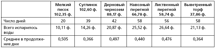 а) Способность почвы испарять воду. Насыщенные водою почвы способны задерживать воду и испарять ее в более или менее продолжительный промежуток времени. В таблице показано количество влаги, испаряемой почвою в определенное время. Опыт произведен в сухой комнате при + 10–15° Р., причем было взято 0,858 куб. фута почвы, насыпанной в полотняных мешках, повешенных в сухом воздухе.