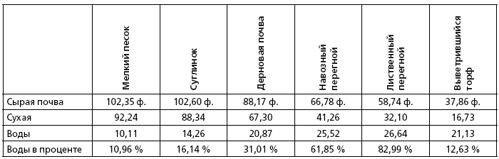 б) Гигроскопичность почвы. Совершенно высохшая земля, как все пористые гигроскопические тела, способна заимствовать некоторое количество влаги из воздуха в виде паров; 100 граммов земли, высушенной в сухой комнате при + 15°Р., следовательно, еще содержавшей гигроскопическую воду, поглотили в 24 часа из воздуха во влажном сарае, оранжерее и теплице при + 2°, 5° и 10° Р. следующие количества влаги: