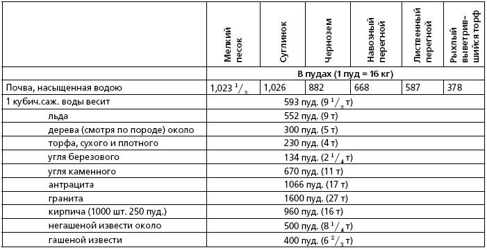 а) Объемный вес. Объемный вес 1 куб. саж. (9 3/10 метра2) наиболее обыкновенных почв следующий.