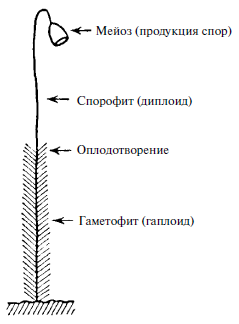 В некоторых случаях непосредственно после мейоза не происходит оплодотворения, и гаплоидная клетка («гамета») претерпевает многочисленные митотические деления, приводящие к формированию полностью гаплоидной особи. Например, самец пчелы – трутень – развивается партеногенетически, то есть из неоплодотворенных, а значит, гаплоидных яйцеклеток матки. У трутня нет отца! Все клетки его тела гаплоидны. Можно назвать его огромным сперматозоидом – и действительно, как известно, это его единственная функция. Однако данная точка зрения нелепа. Такой случай не уникален. Существуют семейства растений, у которых гаплоидная гамета, образующаяся путем мейоза и называемая спорой, падает на землю и, подобно семени, развивается в истинно гаплоидное растение, по размерам сравнимое с диплоидным. На рис. 5 приведено схематическое изображение мха, распространенного в наших лесах. Облиственная нижняя часть представляет собой гаплоидное растение, называемое гаметофитом, потому что на его верхнем конце развиваются половые органы и гаметы, которые путем взаимного оплодотворения дают диплоидное растение – голый стебель со споровой коробочкой наверху. Когда коробочка раскрывается, споры попадают на землю, из них развивается облиственный стебель и т. д. Эту последовательность событий называют чередованием поколений. Можно взглянуть подобным образом на человека и животных. Однако «гаметофит» у них, как правило, представляет собой короткоживущее одноклеточное поколение, сперматозоид или яйцеклетку. Наше тело соответствует спорофиту. Наши «споры» – запасенные клетки, из них посредством мейоза образуется одноклеточное поколение.