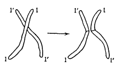 Рис. 6. Кроссинговер. Слева: контакт между двумя гомологичными хромосомами. Справа: гомологичные хромосомы после обмена и расхождения