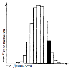 Рис. 7. Статистика длин остей у чистой линии ячменя. Группа, выбранная для посева, показана черным цветом (Это не результаты некоего эксперимента, а теоретический пример)