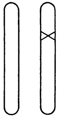 Разумно предположить, что некую наблюдаемую мутацию вызывает изменение определенного участка одной из хромосом. Так и есть. Важно отметить, что мы точно знаем: это изменение затрагивает лишь одну хромосому, но не соответствующий «локус» на гомологичной хромосоме. Это схематично показано на рис. 8; мутировавший локус обозначен крестиком. Факт, что мутация происходит только в одной хромосоме, можно доказать, скрестив мутантную особь («мутанта») с нормальной. Половина потомства будет обладать мутантным признаком, а другая половина – нормальным. Этого следует ожидать вследствие расхождения двух хромосом у мутанта во время мейоза, как схематично показано на рис. 9. Это «фамильное дерево», на котором каждая особь (из трех последовательных поколений) представлена парой рассматриваемых хромосом. Имейте в виду, что если у мутанта затронуты обе хромосомы, все его потомки получат одинаковое (смешанное) наследие, отличное от родительского.