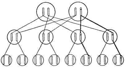 Рис. 9. Наследование мутации. Поперечные прямые линии показывают передачу хромосомы, двойные линии – передачу мутантной хромосомы. Неучтенные хромосомы третьего поколения пришли от партнеров второго поколения, не включенных в схему. Предполагается, что это не родственники, лишенные мутаций